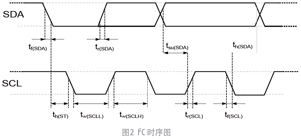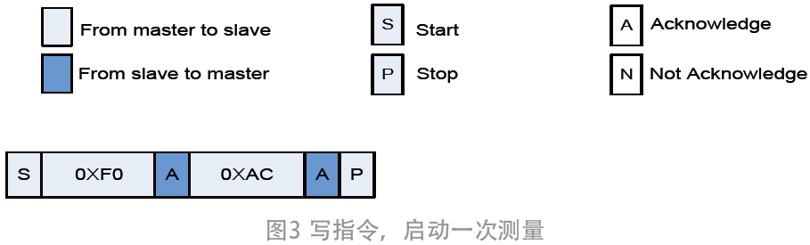 0×F0 表示默认的7 位I2C 传感器从机设备地址为0×78,最后1 位为0 表示主设备MCU对从设备进行写操作•。0×AC 为命令字,启动从设备传感器进行一次测量,如图3 所示▼。