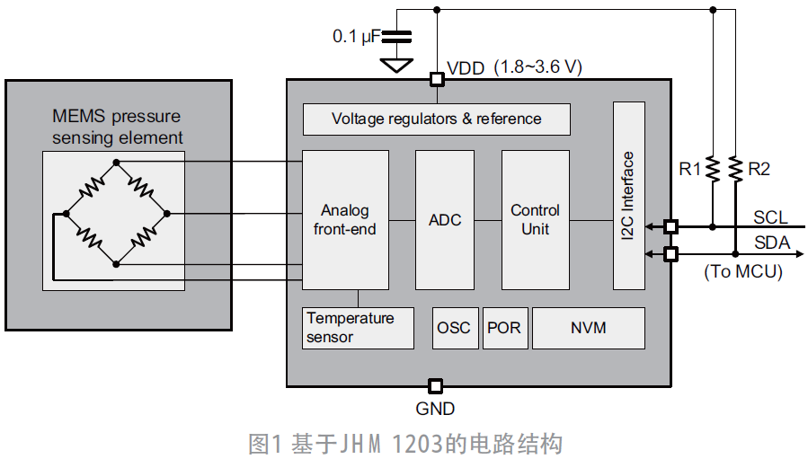 如图1 所示,JHM1203 基本电路为标准的I2C 电路☆▪,正常工作仅需要三个外部元件,其供电范围为1.8~3.6 V,与绝大多数的MCU兼容△。