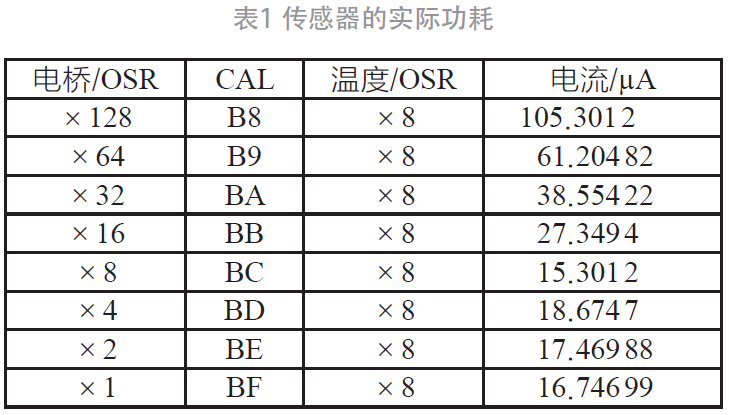 JHM1203 专门为低功耗的应用而设计,其待机电流为0.1 μA,表1 为JHM1203 带外部5 kΩ 桥阻时的实测功耗,在1 Hz ODR 的最小功耗约16.7 μA。