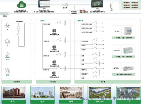 为响应政策号召,安科瑞构建了精准高效的公共建筑能耗监测体系。该体系按电量、水耗量等不同能源种类,以及照明插座、空调、动力等用能用途进行分项计量,搭配单相、三相全系列电能表,涵盖导轨式、嵌入式等多种安装方式,可灵活适配变电所、楼层配电、特殊用电等各类场景,数据精度达到 0.2S 级~0.5 级,为后续的能耗分析提供了坚实可靠的数据支撑。依托长期监测积累的完整数据库,安科瑞不仅助力各地区制定公共建筑能耗定额地方标准,还提供了配套的落地管理方案。通过预付费电能表的分合闸控制、时控、负控等功能,结合既定的能耗定额指标,实现超定额自动断电或超额计费的管控模式,从用电终端引导用户节约用电,让能耗定额标准真正落到实处,避免沦为 “纸上谈兵”。